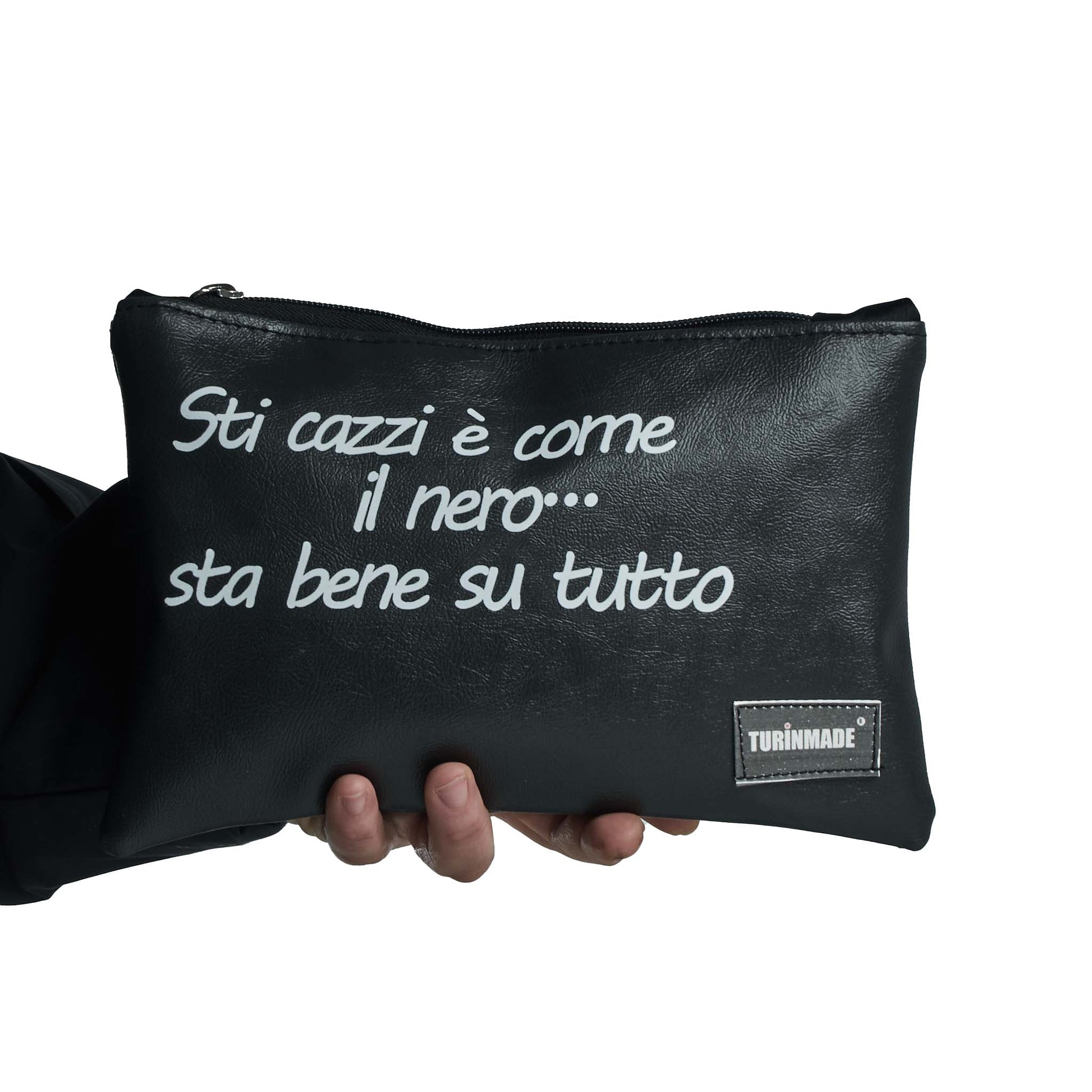 Le nostre pochette sono in finta pelle, e foderate uniscono praticità e carattere: ogni frase stampata è un messaggio leggero, un sorriso da portare con sé.
