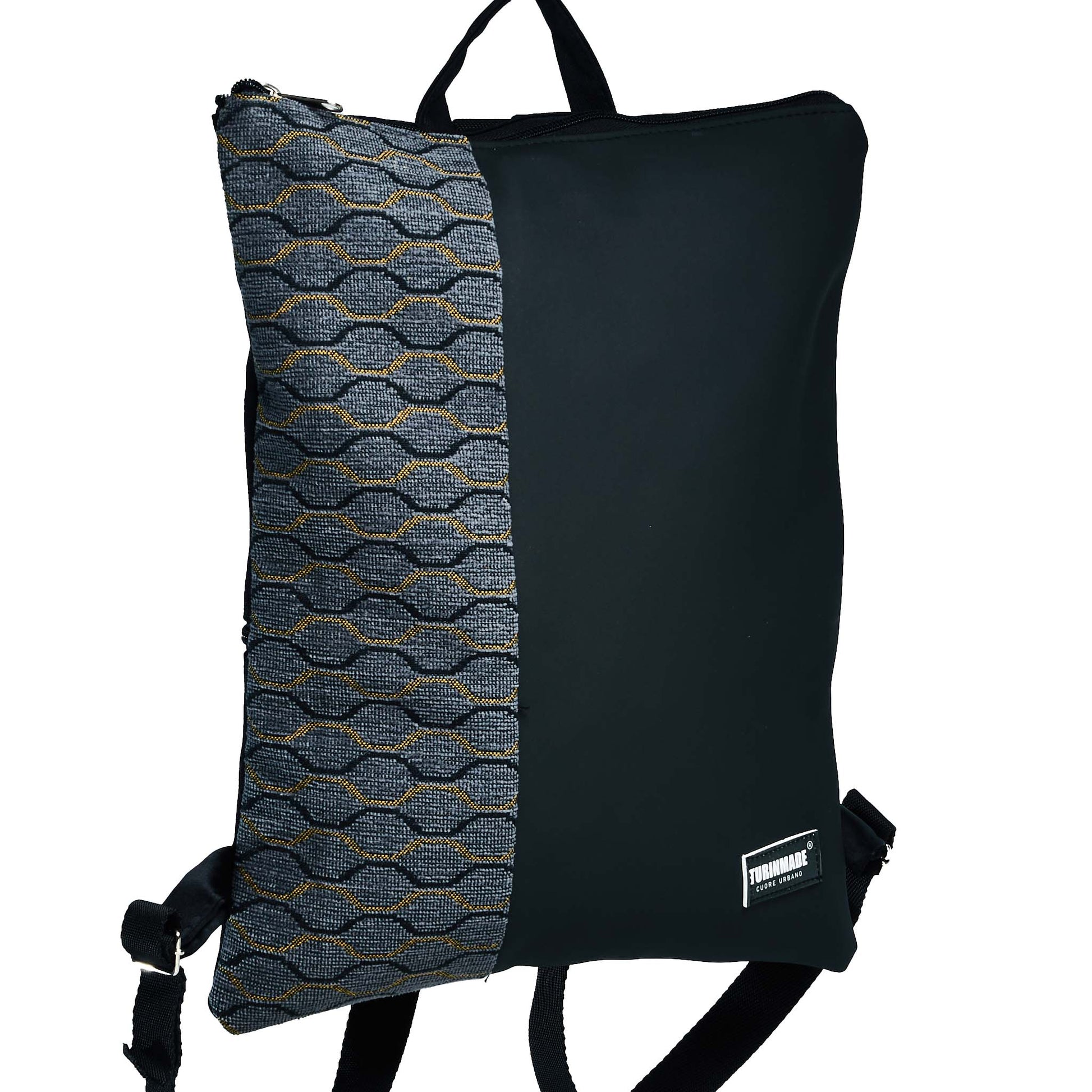 - La parte esterna in ecopelle nero +tessuto fantasia geometrica