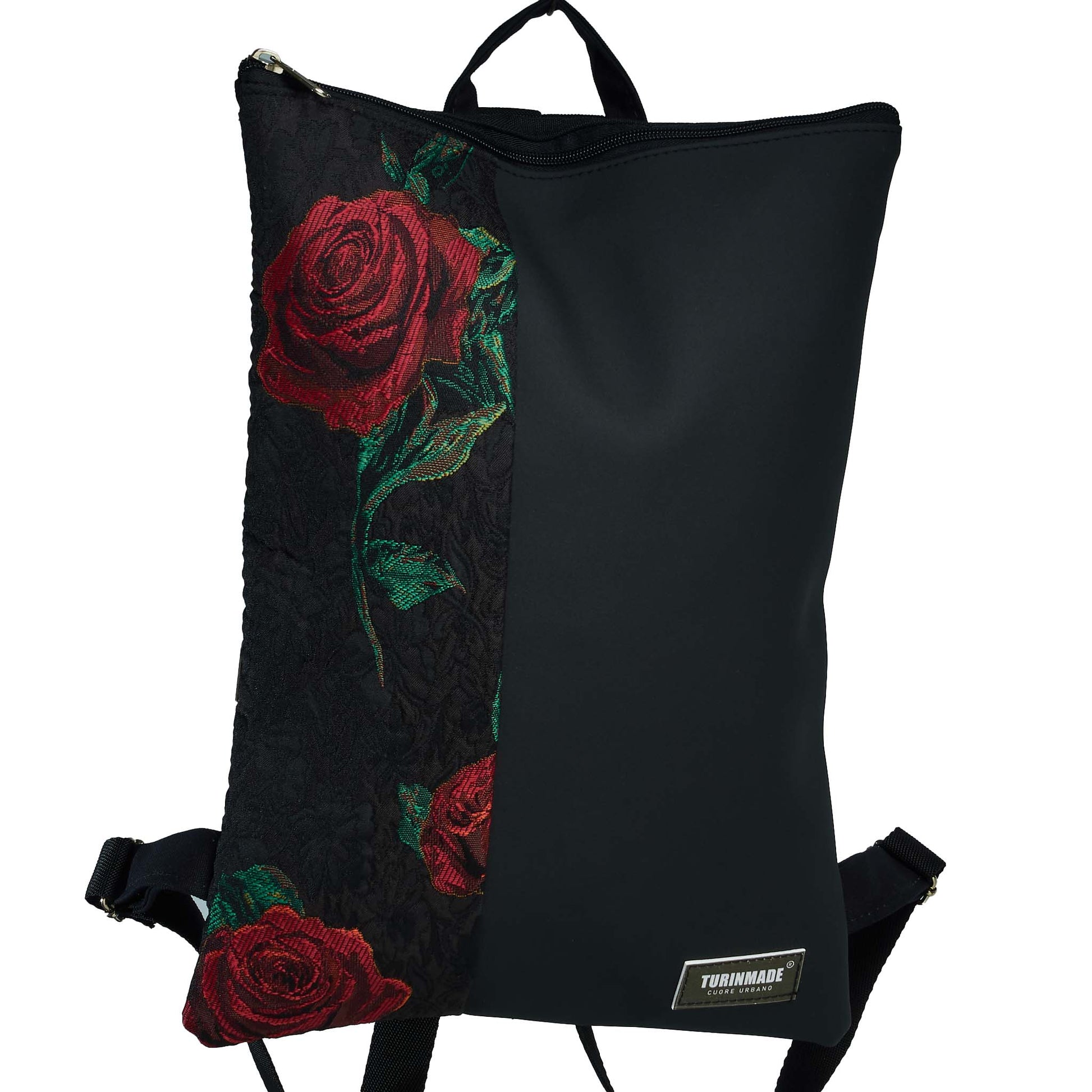 - La parte esterna in ecopelle +tessuto fantasia jacquard rosa con sfondo nero