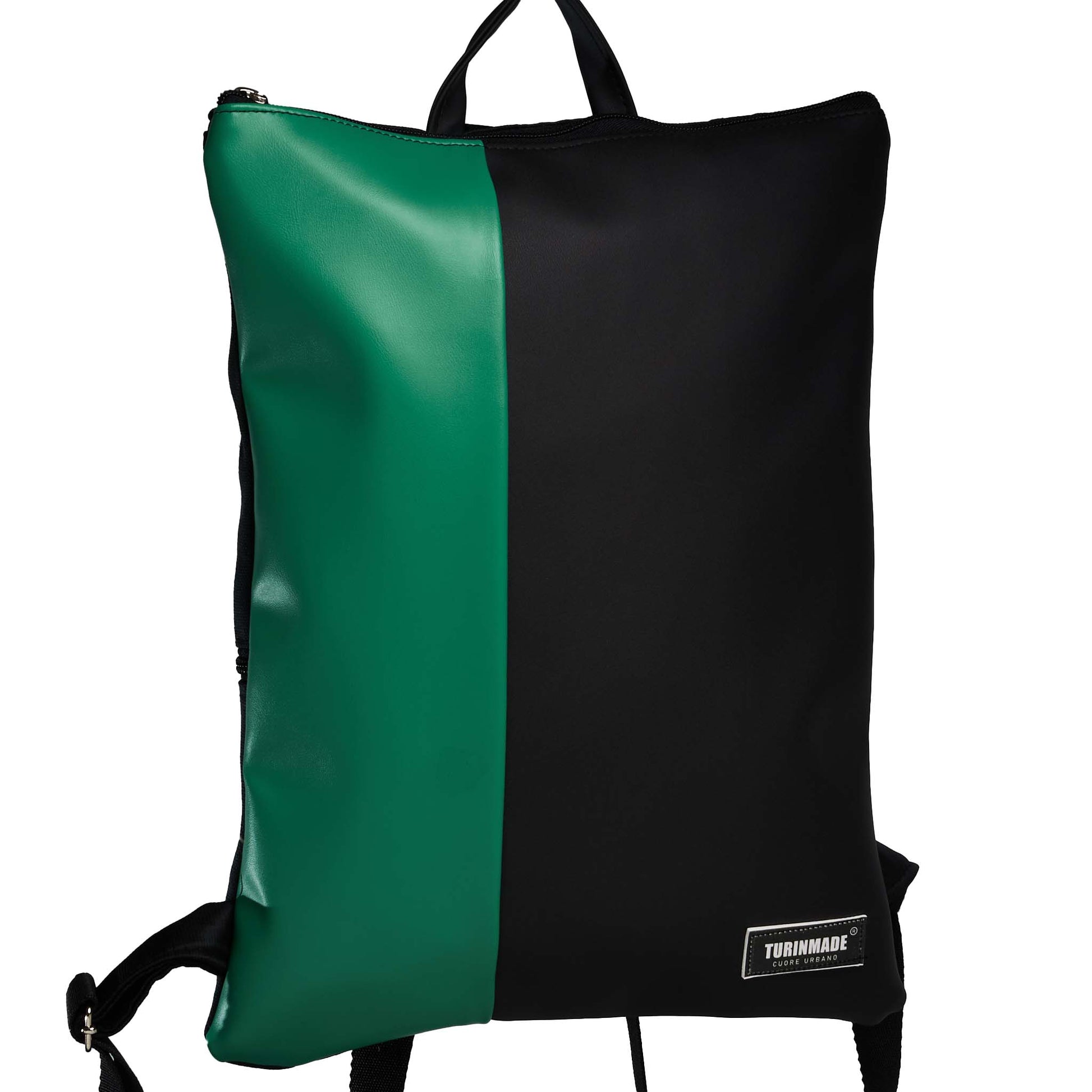 Realizzato a mano con finiture di qualità, lo zaino in patchwork di ecopelle nera e fascia verde è un'opzione elegante e versatile. Con una tasca interna imbottita e schienale in neoprene riciclato, è perfetto per trasportare tutto ciò di cui hai bisogno senza appesantirti. Le dimensioni (43x32cm) e gli spallacci regolabili (3cm) lo rendono comodo da indossare tutto il giorno.