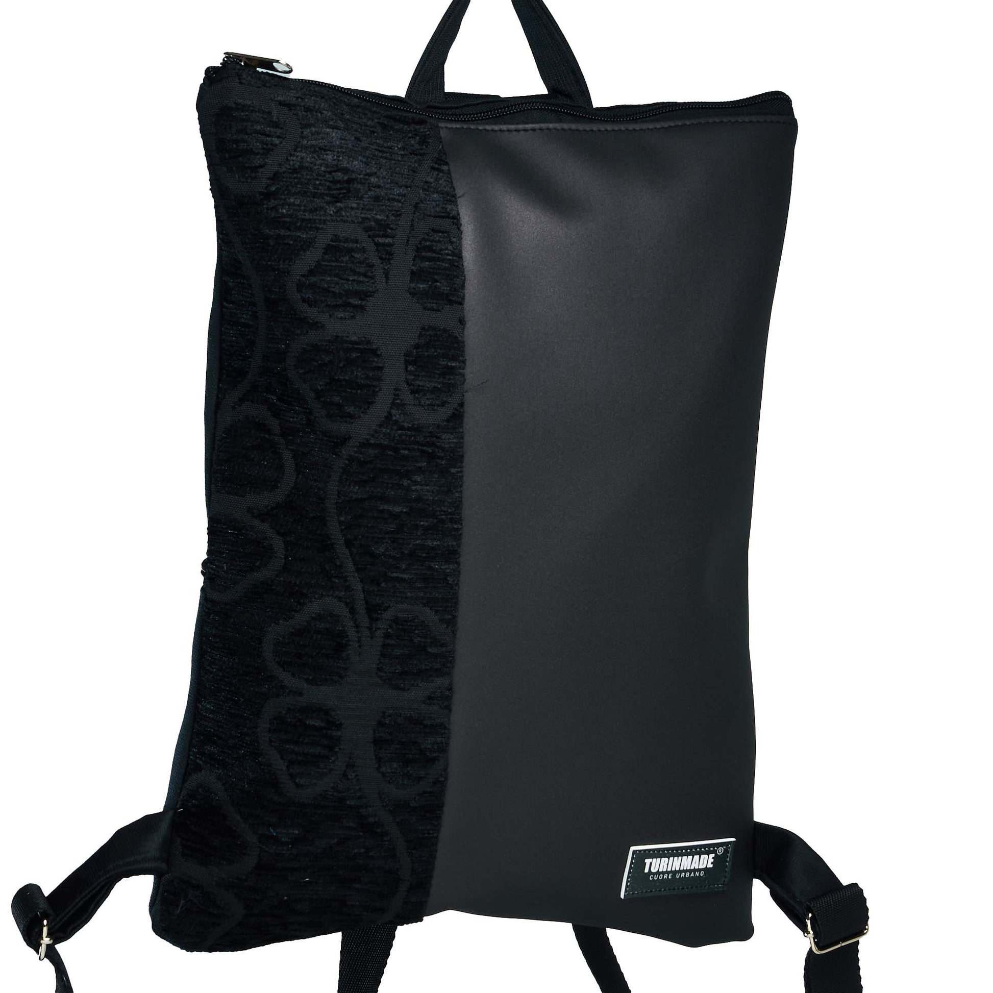 è caratterizzato da un design robusto e resistente. Realizzato a mano con patchwork di ecopelle e tessuto jacquard nero su nero fantasia, schienale in neoprene riciclato da interni di auto, dimensioni 43x32 cm e spallacci da 3 cm regolabili, e fibbia scorrevole in acciaio. Resistente all'abrasione e all'acqua, questo zaino è ideale per gli amanti dell'avventura.